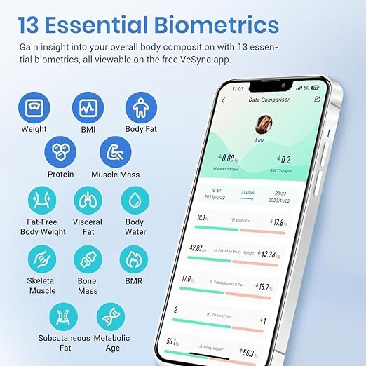 Sveobuhvatna analiza sastava tela – Idite dalje od osnovnog merenja težine. Ova vaga za merenje telesne masti meri 13 ključnih parametara, uključujući BMI, telesnu mast, mišićnu masu, količinu vode u telu, proteine, koštanu masu i BMR, pomažući vam da pratite zdravlje i efikasno ostvarite svoje fitnes ciljeve.